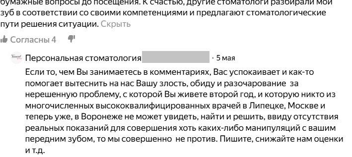 | Игнорирование отрицательных отзывов. Это может быть прямое игнорирование (отсутствие ответа или попытки решить вопрос проблему), формальная отписка «нам очень жаль, будет видеть вас снова», или даже обвинения клиента в ответ. | Ошибки в работе людей, брак товара или неудачи в услугах случаются даже у лидеров рынка. Клиенты не ищут идеальные компании, они ищут надежных партнеров, с которыми можно договориться. Игнорируя негатив, компания демонстрирует, что клиент берет все риски на себя. Чем выше риски – тем менее приемлема может быть такая ситуация клиенту. | Не скрывайте негатив и не пытайтесь оправдываться. Профессионализм – это, в том числе, навык признавать ошибки и работать над удовлетворенностью клиента. Выразите сожаление, объясните почему ситуация мола произойти (не оправдывайтесь, но покажите, что понимаете, в чем дело и знаете, как не повторить проблему), предложите решение. Если клиент идентифицируется из отзыва – свяжитесь лично. Если нет – оставьте прямой контакт (например, почту или добавочный номер клиентского сервиса). |