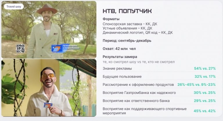 Результат: среди зрителей шоу был отмечен рост знания рекламы продукта на 27%, рассмотрение к оформлению продукта выросло на 17-22%.